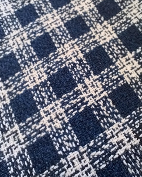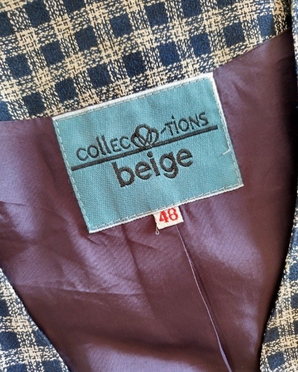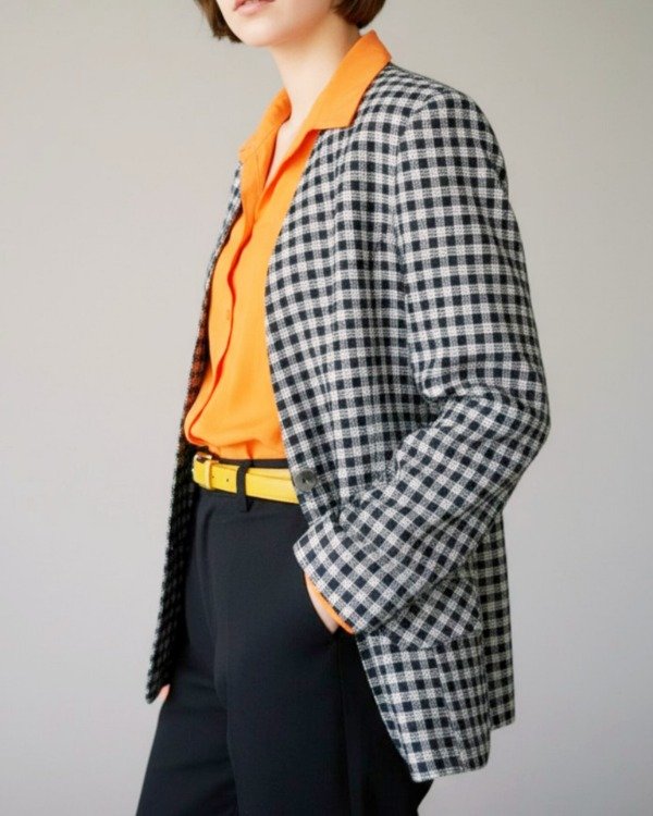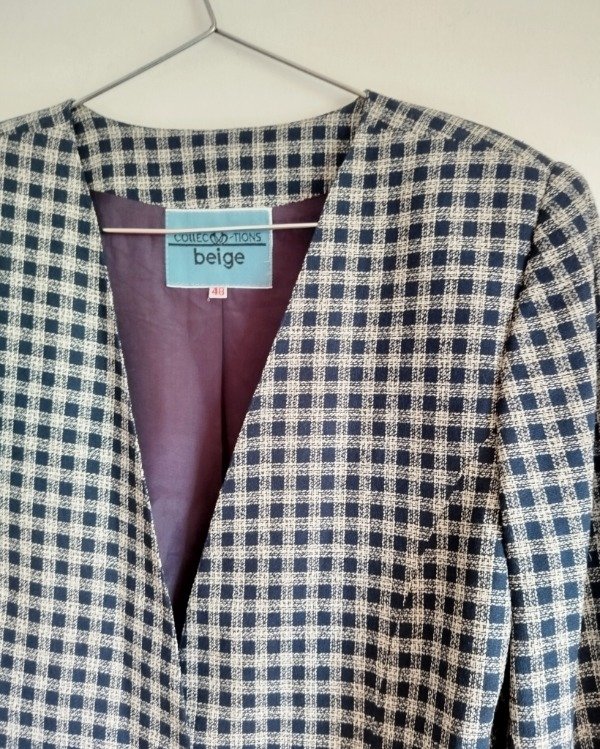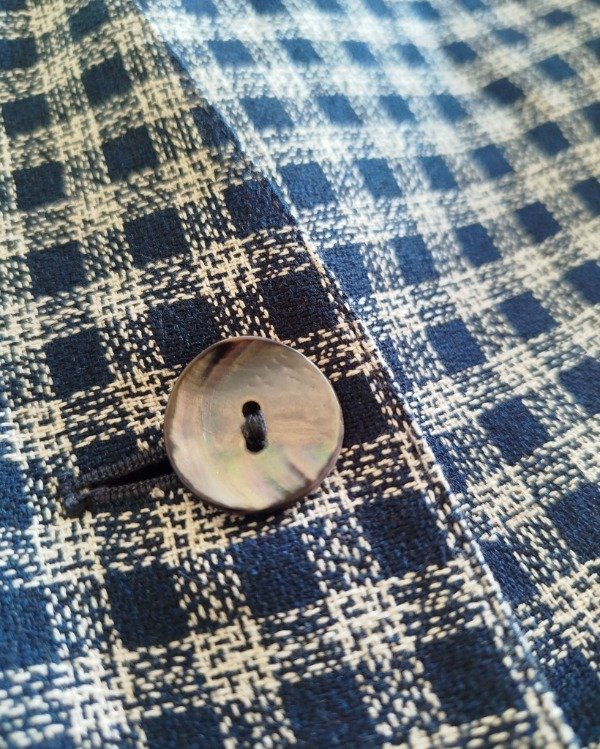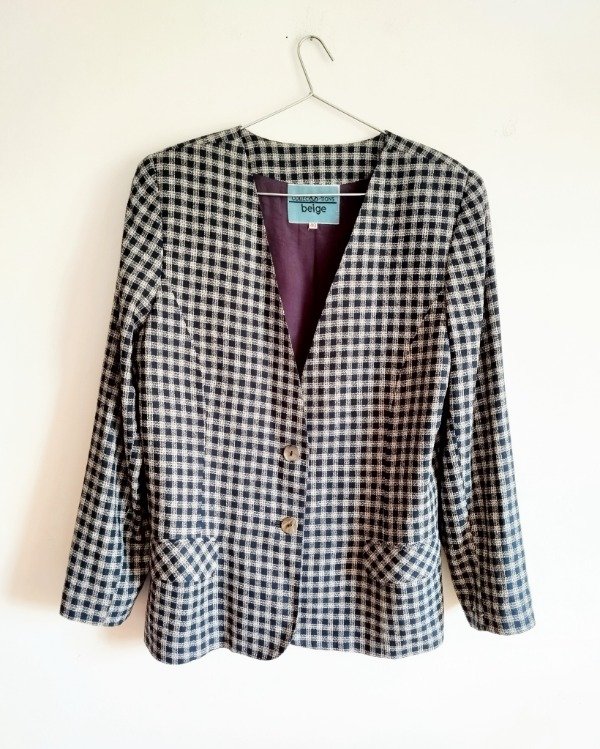 Blazer media estación, años 90. Confeccionado en lino y algodón, cuadrille azul/ blanco. Liviano, interior forrado en tafetán, tiene hombreras internas que se pueden retirar. Botones de nacar .