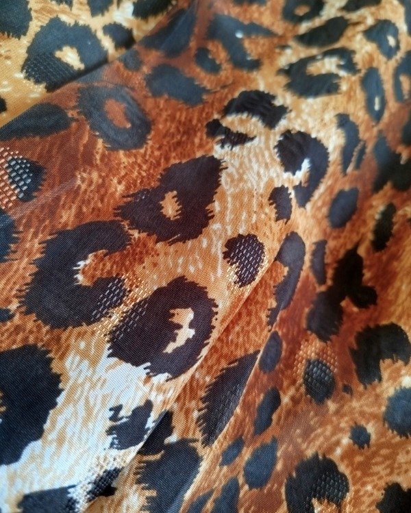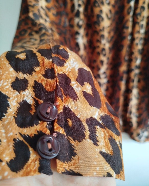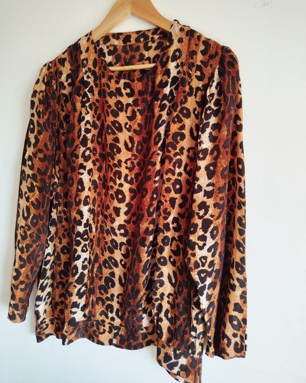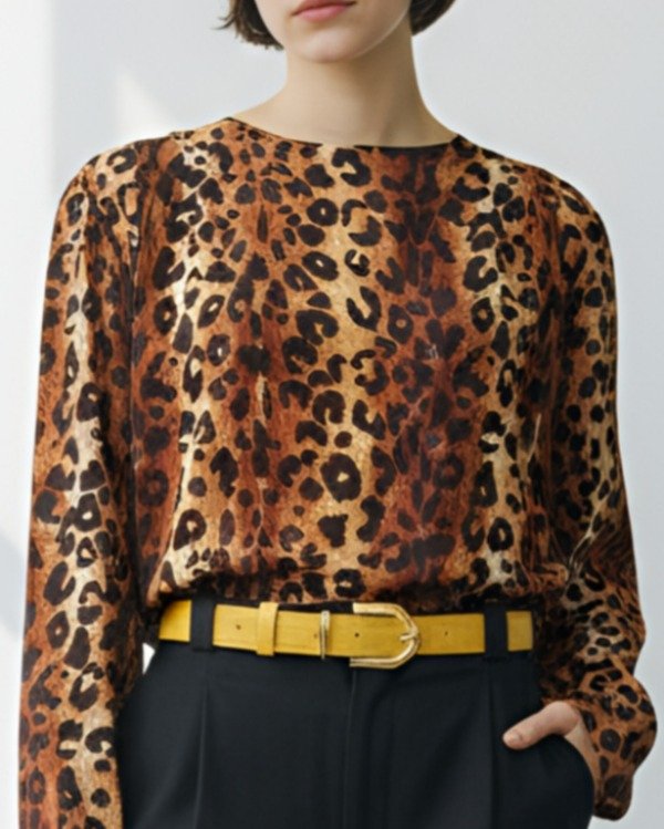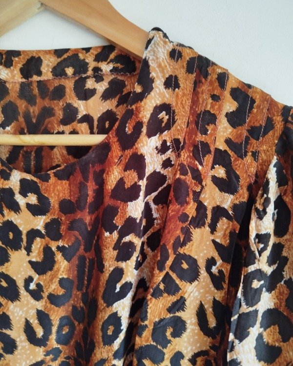 Blusa .confeccionada en poliéster estampado de leopardo. Hermoso s detalles de tableado al frente.