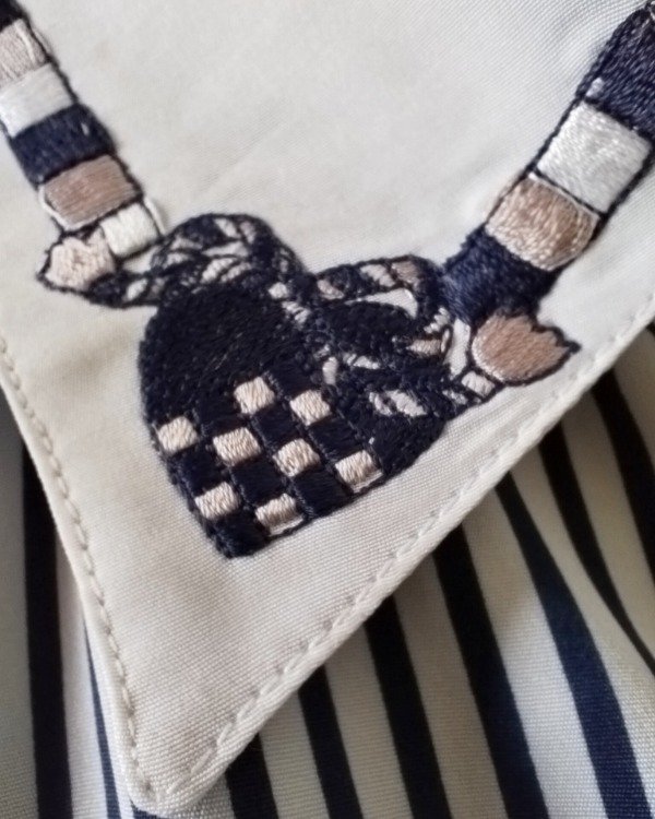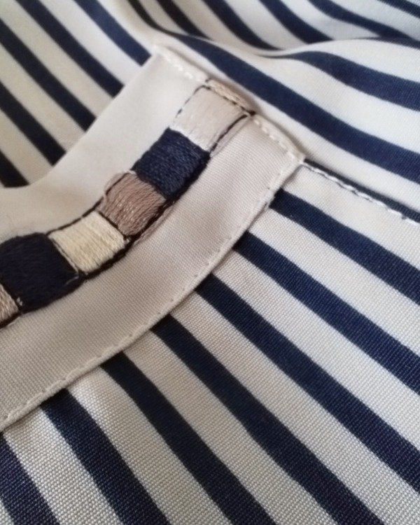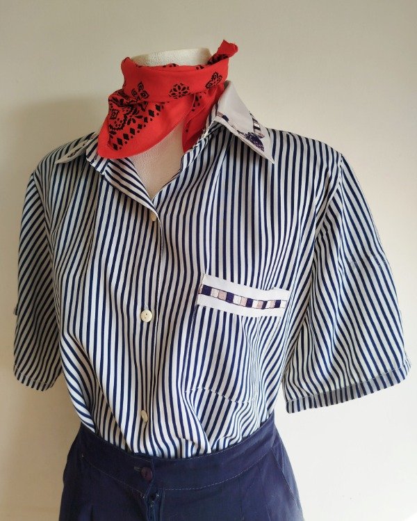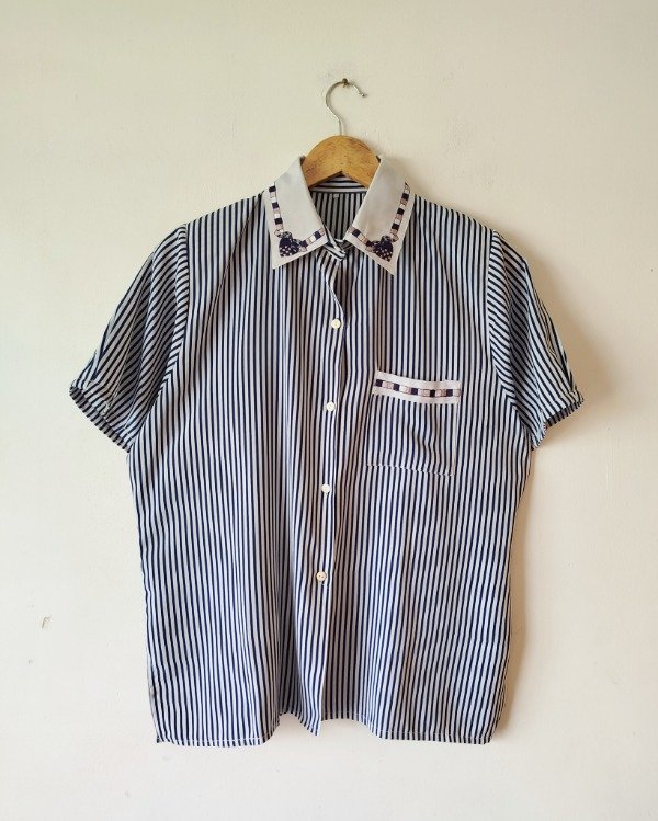 Camisa estilo navy, años 90, poliéster rayado blanco/ azul. Bordado en cuello y bolsillo. Tiene hombreras pequeñas que se pueden retirar.