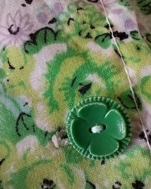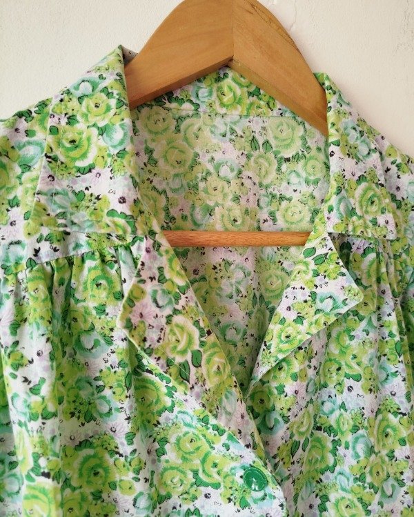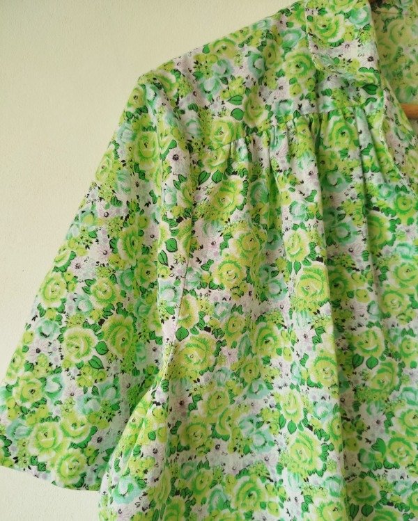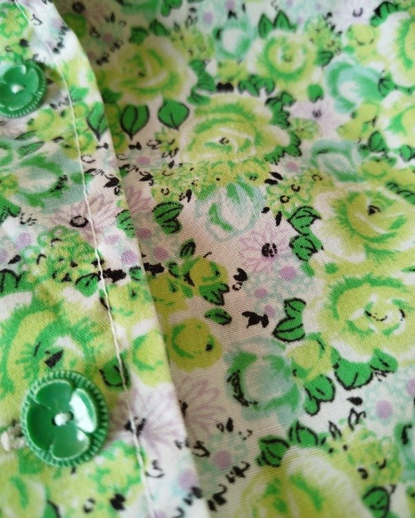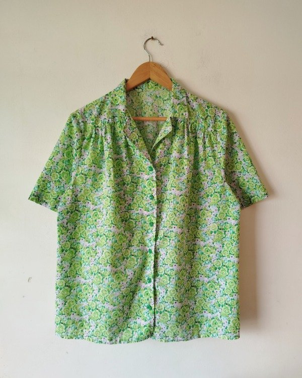 Camisa de algodón estampado floreado tonos de verde, botoncitos en forma de flor.