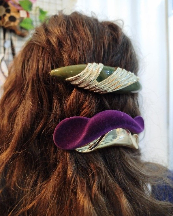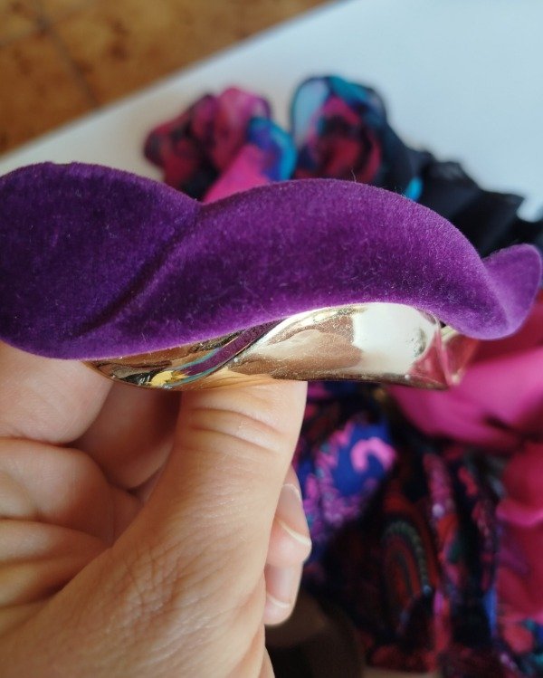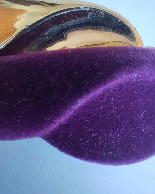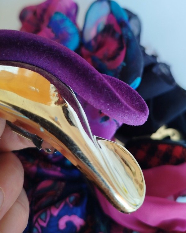 Hebillas original años 90, plástico duro, con cubierta de felpa gamuzada color violeta y metal dorado, hebilla vintage de buen agarre.