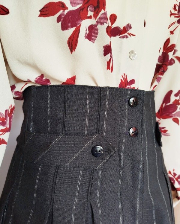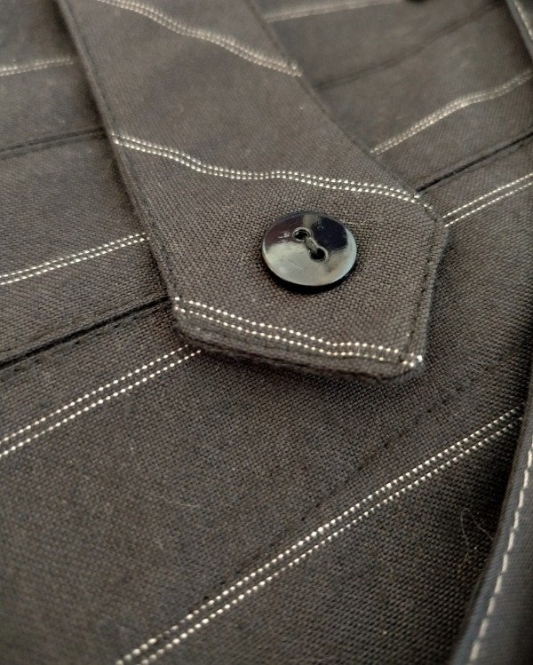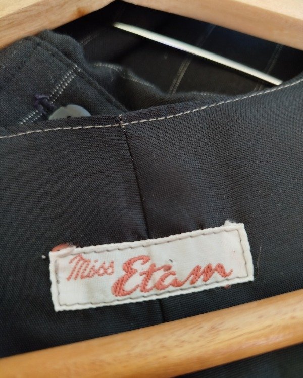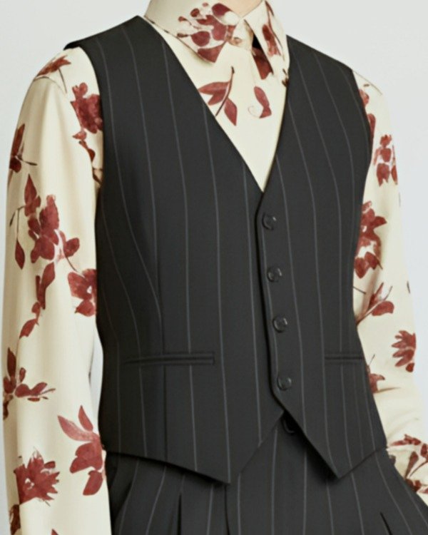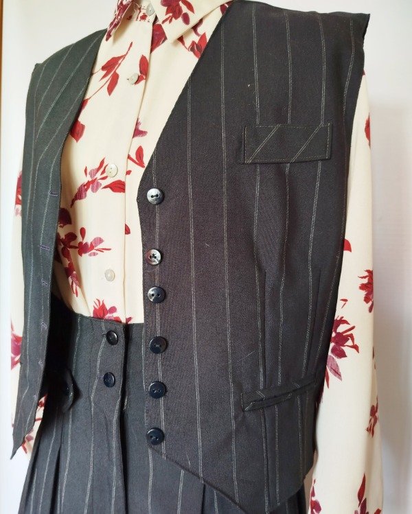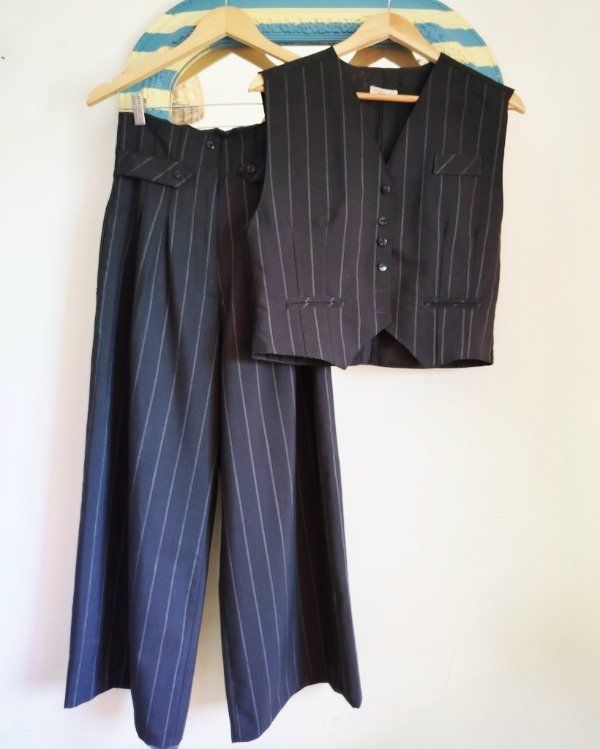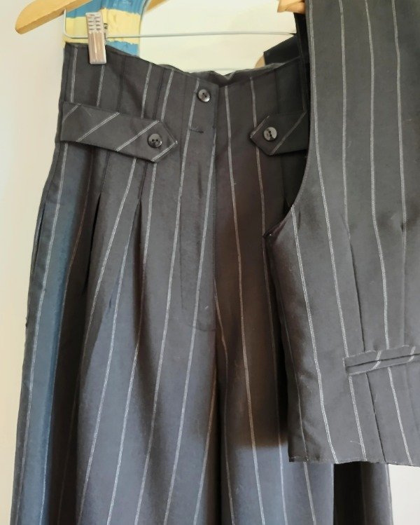 Conjunto de corte sastrero , chaleco y palazzo, confeccionado en poliéster y algodón. Color gris oscuro con lines finas gris claro. Pantalon tiro super alto, . Bolsillos laterales. Pueden comprar el conjunto o las prendas por separado.