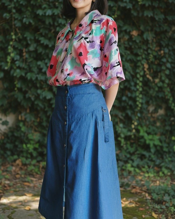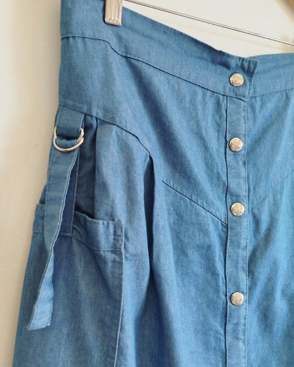 Falda años 80, nueva, de depósito, confecvionada en denim liviano. Abotonada al frente, con cintura elastizada en la parte trasera, y detalle de trabitas en los bolsillos.