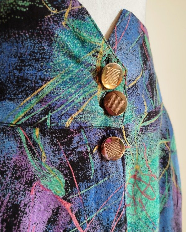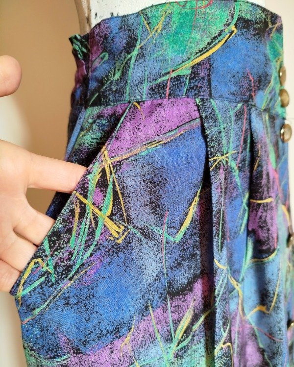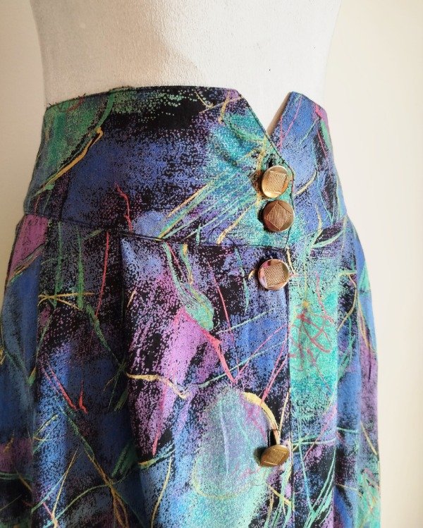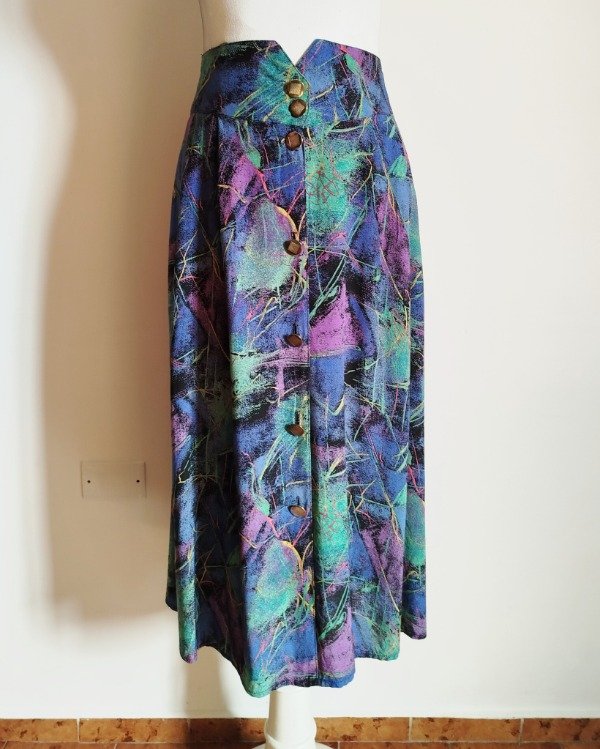 Falda larga, de algodón estampado, abotonada al frente,Cintura con elástico trasero. Bolsillos laterales.
