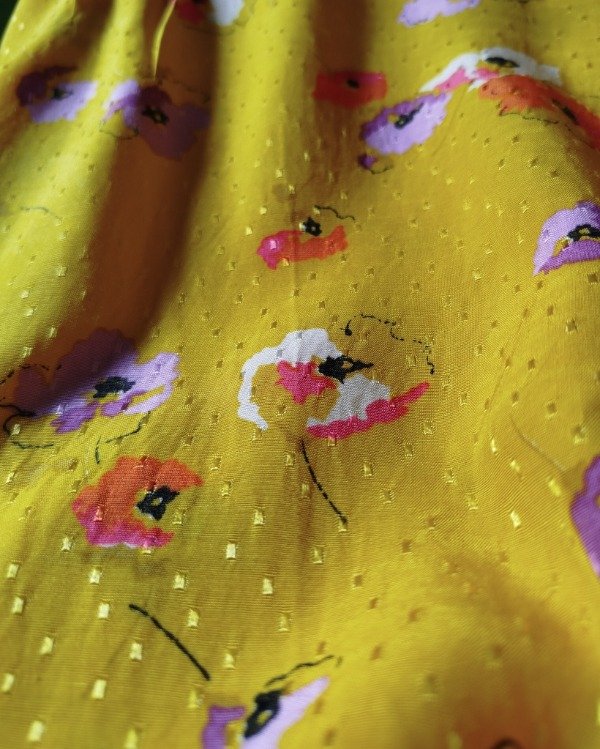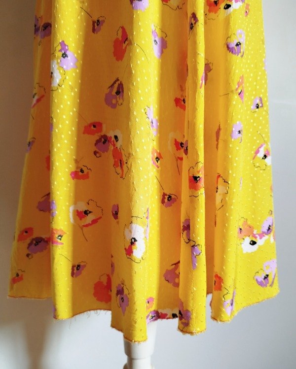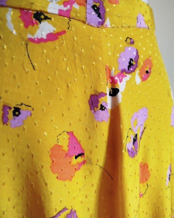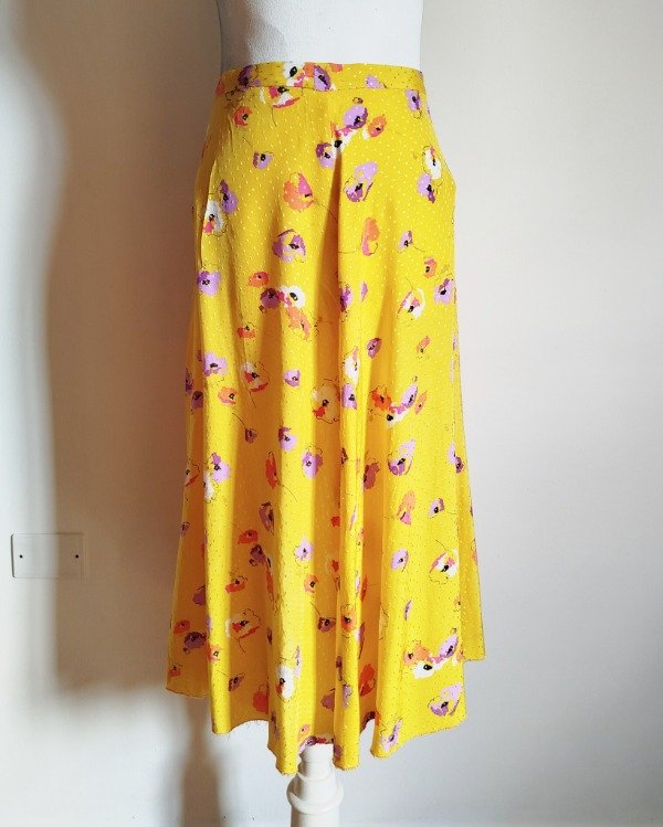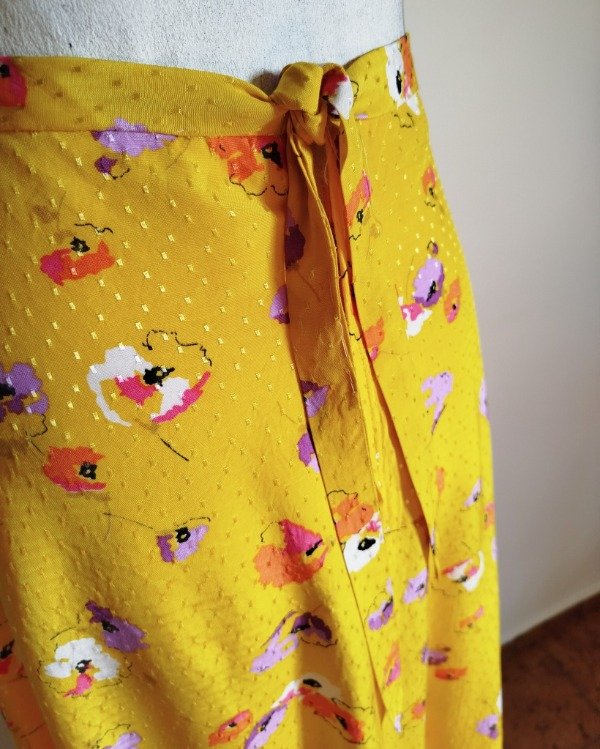Falda acampanada, de poliéster tramado. Cierre trasero y lazo.