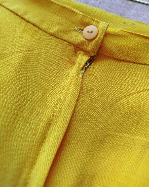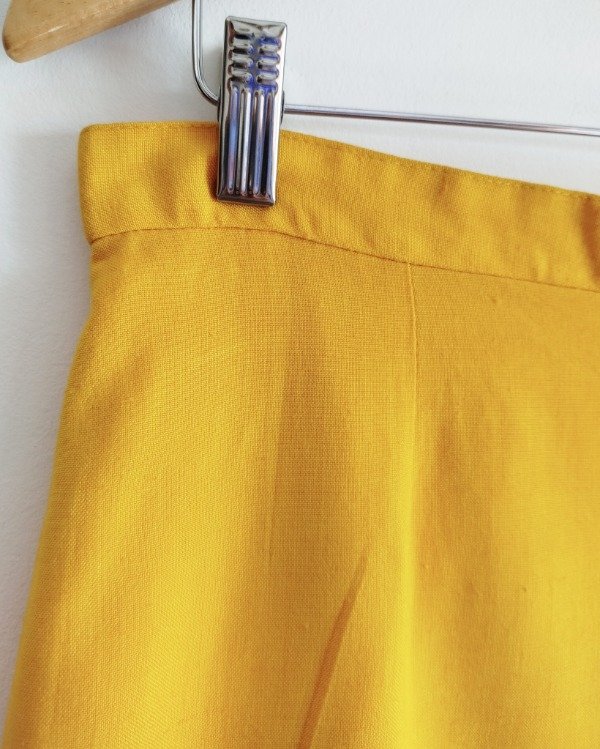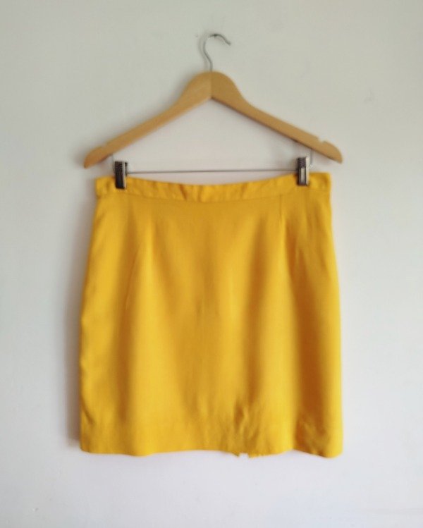 Falda corta de lino , color amarillo, interior forrado en tafetán. Cierre trasero.
