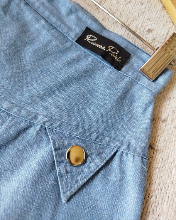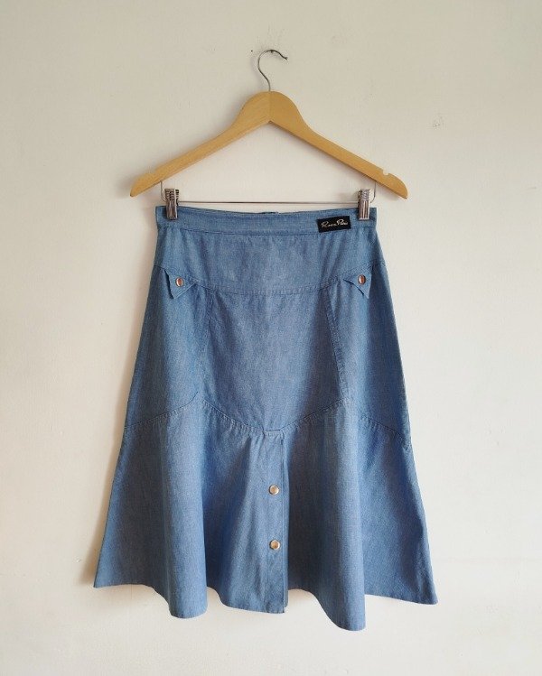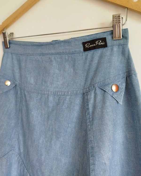 Falda vintage años 80, de jean liviano color celeste, largo midi.