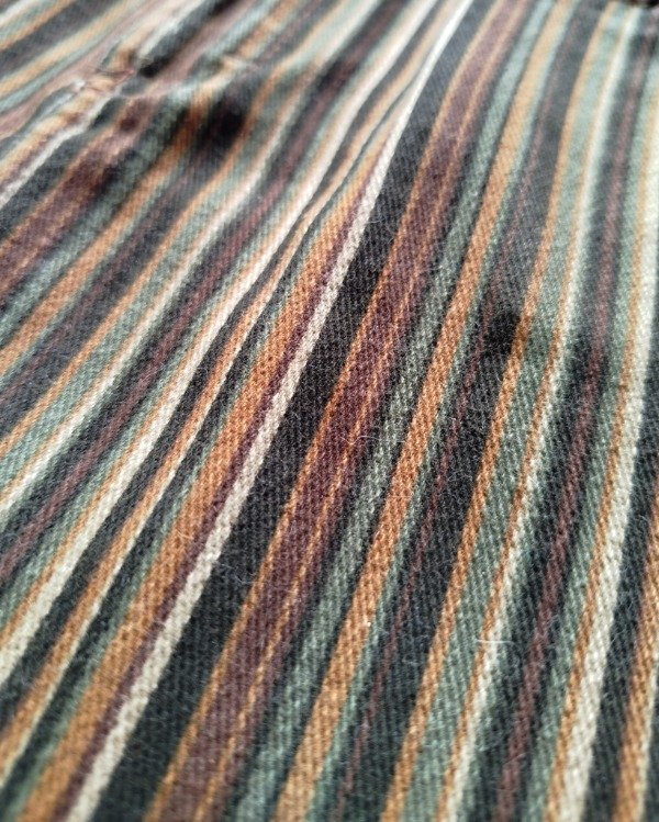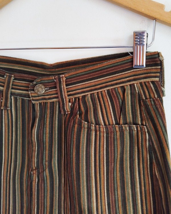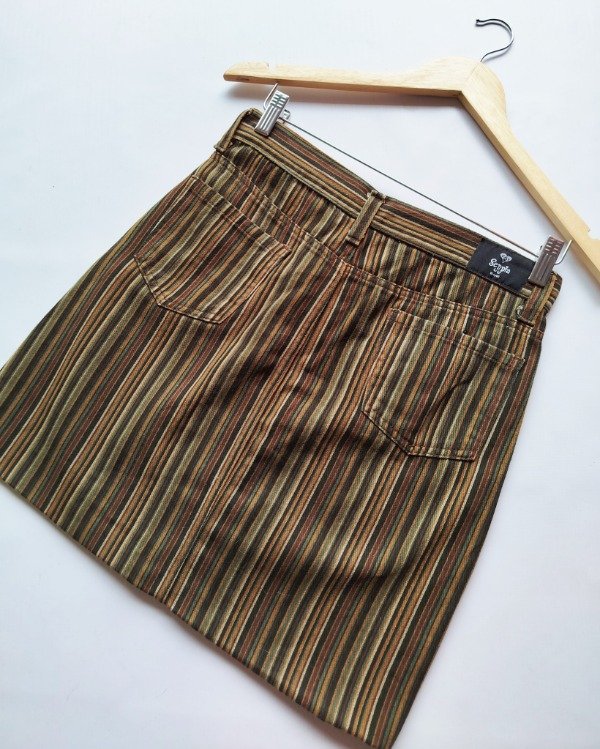 Falda corta de gabardina y algodón, estampado a rayas. Cierre delantero y pasacinto