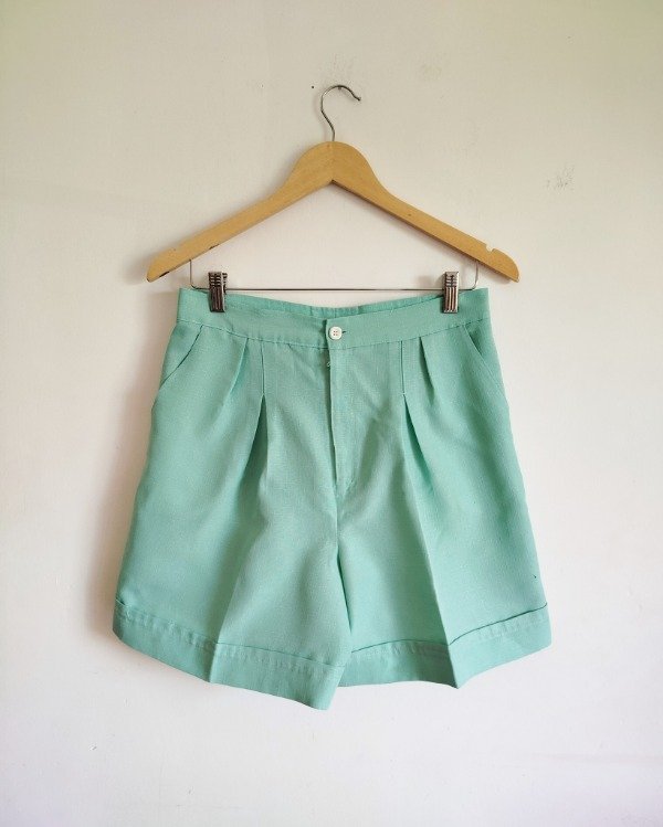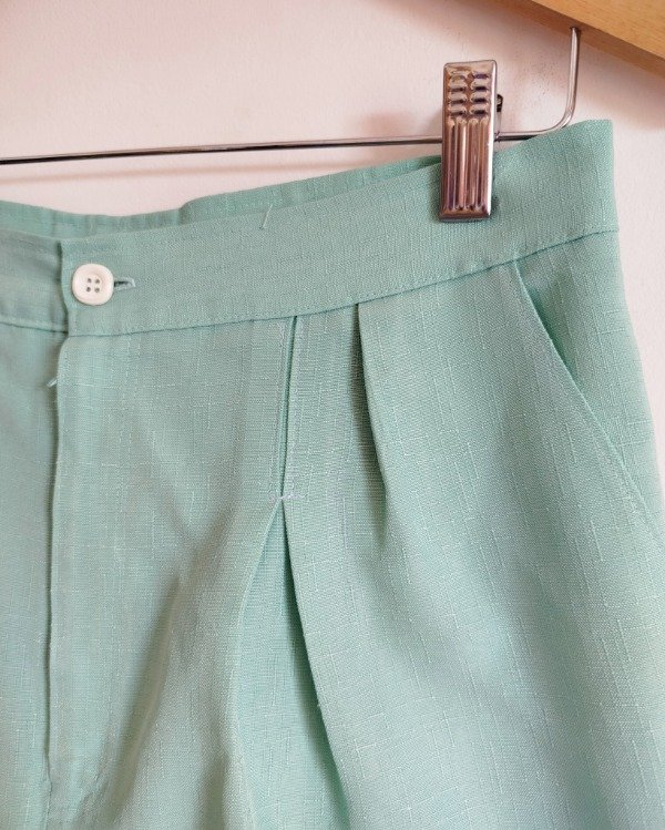 Bermuda tipo sastrera,poliéster y algodón, color aqua cintura con cierre frontal .Tiro alto., bolsillos laterales