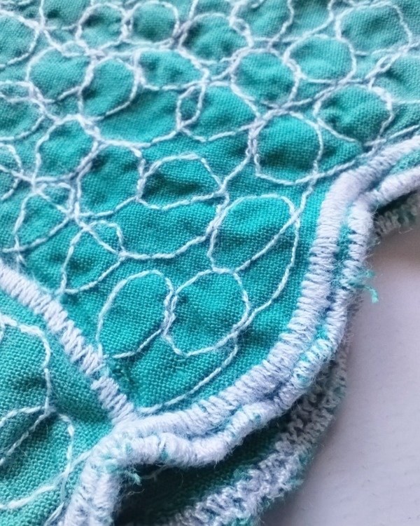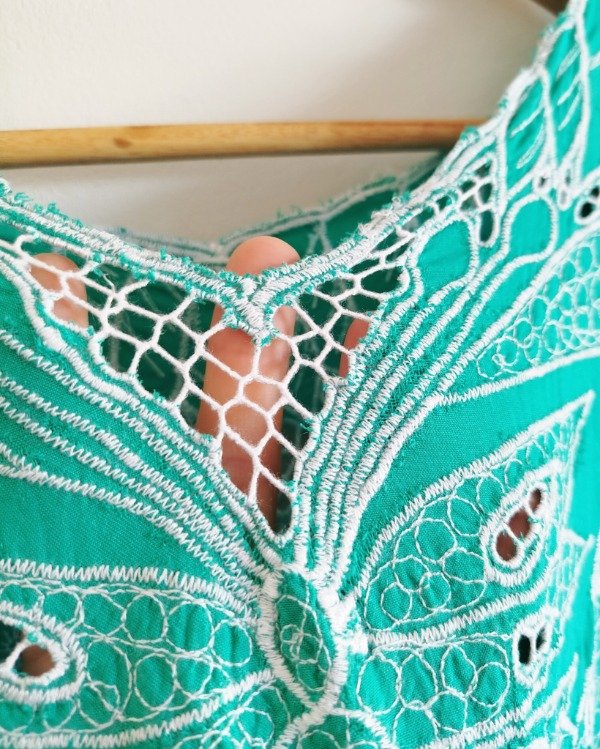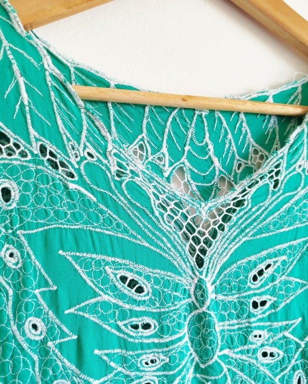 Blusa de algodón, color verde aguamarina, totalmente bordada con diseño de mariposa