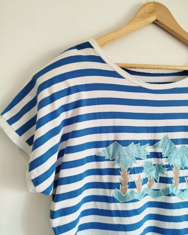 Remera vintage años 90, 100% algodón .rayaso azul y blanco, con aplique bordado al frente. corte de manga tipo estilo japones . Tiene pequeñas hombreras que se pueden retirar.