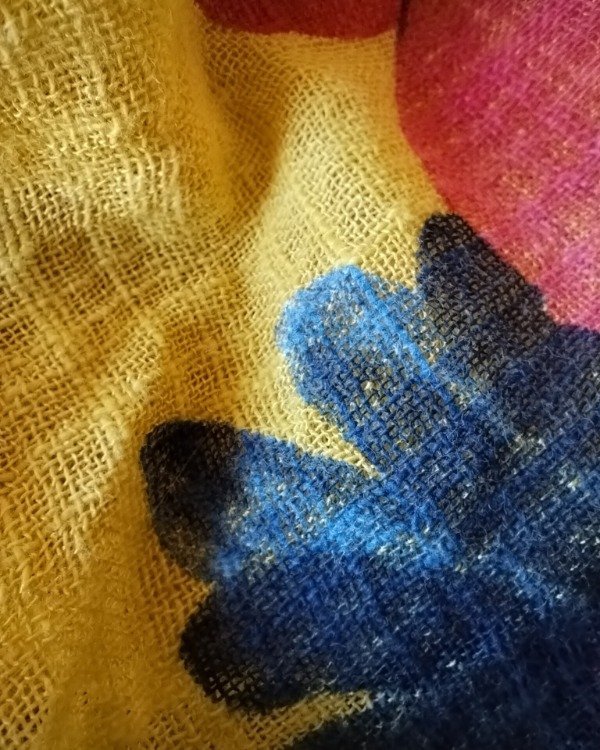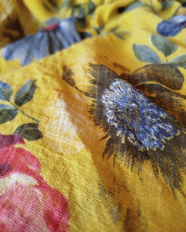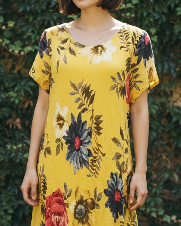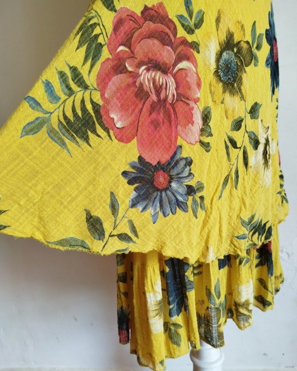 Vestido ,confeccionado en lino rústico de trama abierta, estampado floral,doble capa , la de abajo hace de forro terminando en volado y la superior mas corta.