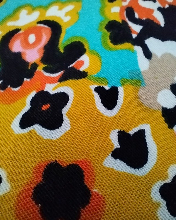 Vestiido nuevo , de depósito, Confeccionado en los años 60/70, Tela de algodón estampado floral de estilo bohemio, característico de eses años., con paneles de diferentes patrones que se unen para formar un diseño de retazos.